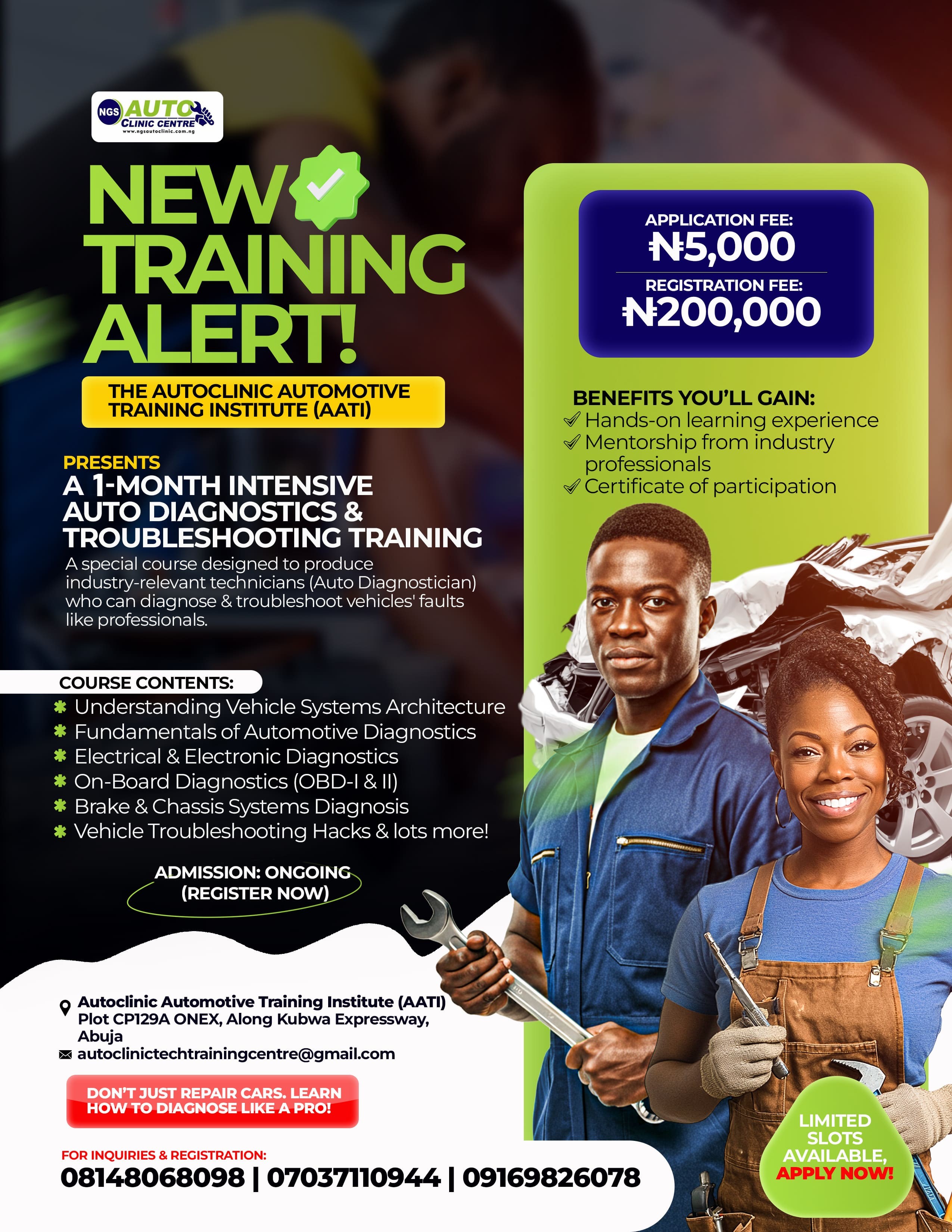 At the end of the training you will come out as competent Auto diagnostician and as well as Auto Service Technician, you will also have the skills to use any modern diagnostic tool to communicate with and retrieve codes from any Onboard Diagnostics Compliant vehicle.